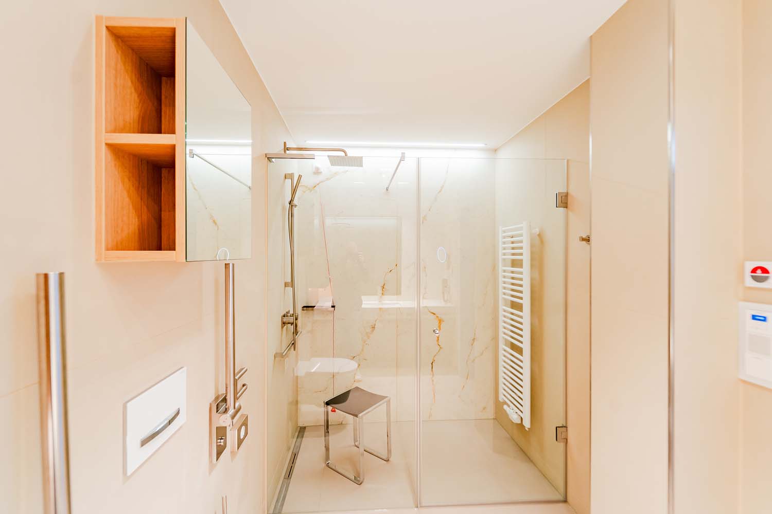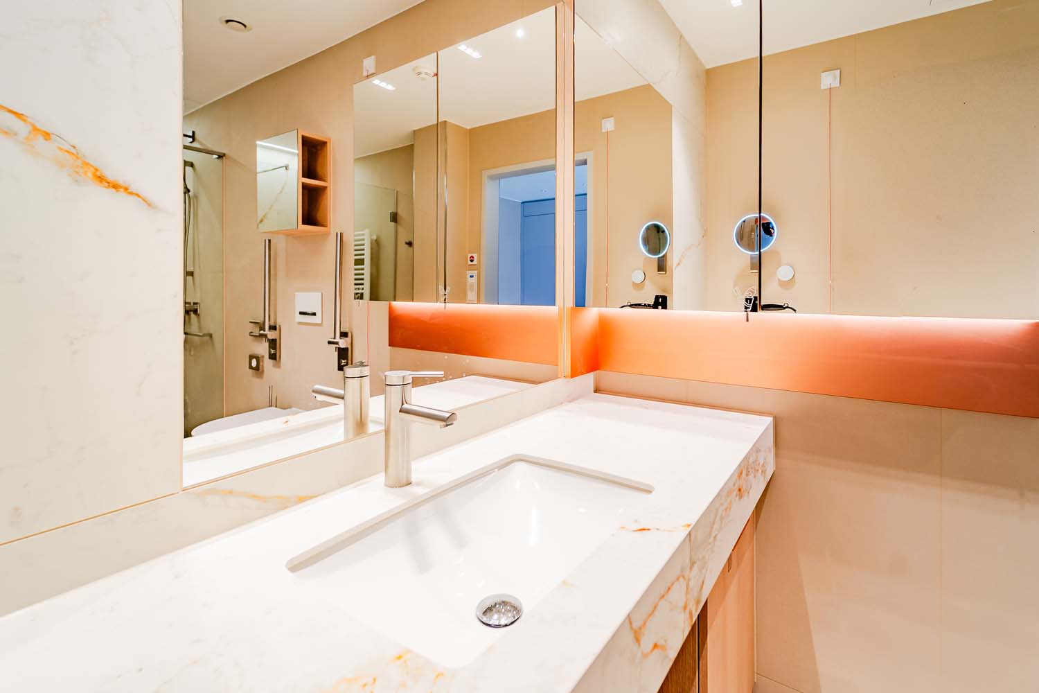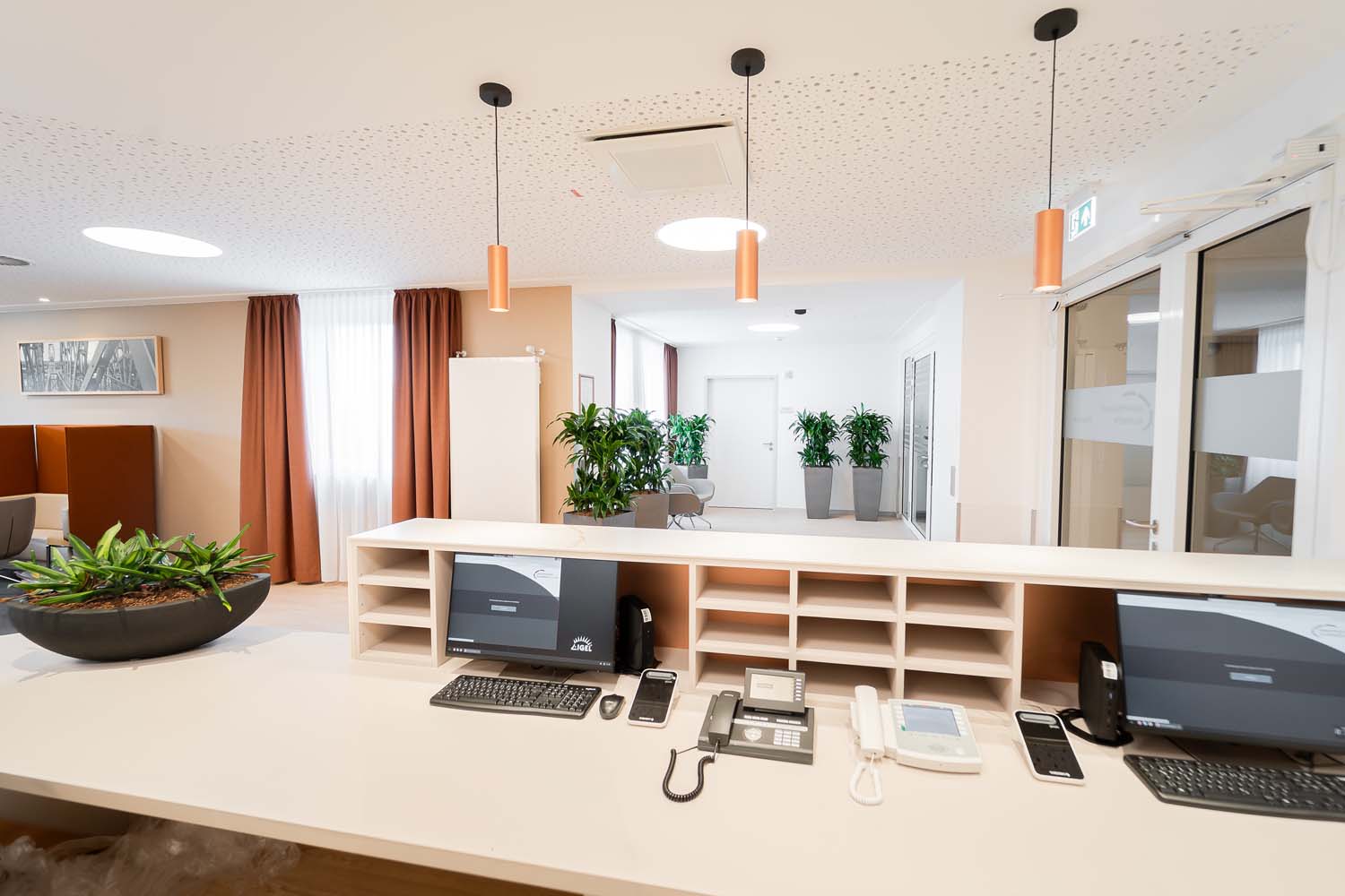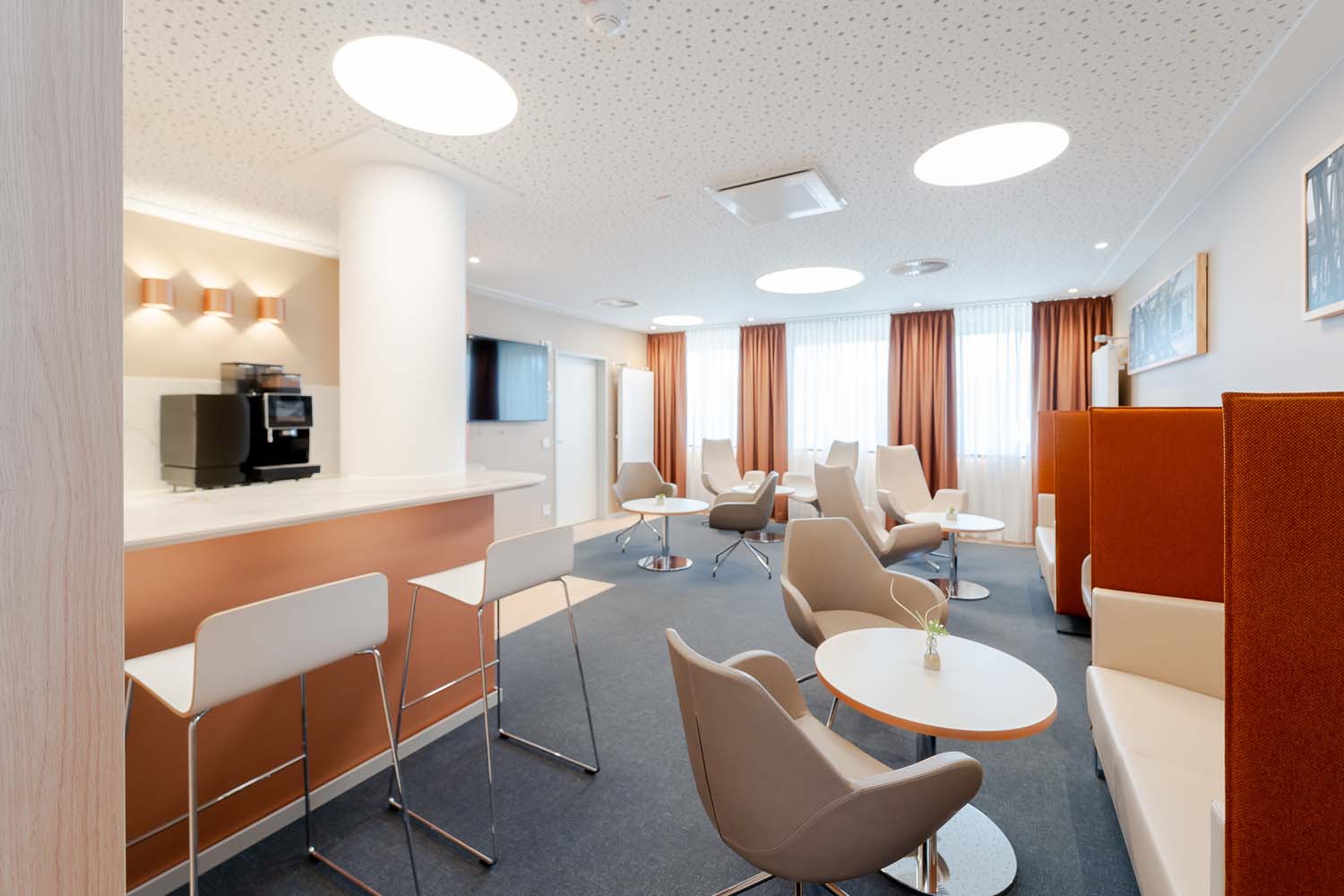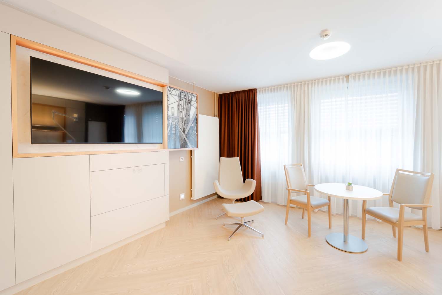 Sand- und Bronzetöne, dazu viel Weiß, Design-Mobiliar und eine behagliche Atmosphäre prägen die neue geriatrische Komfortstation, die im 3. OG eines Gebäudeteils entstanden ist. Die 1.145 m² große Fläche wurde, bis auf die tragenden Wände und die Außenwände, komplett entkernt. Jetzt ist sie mit 13 großzügigen, barrierefreien Zimmern sowie hochwertig ausgestatteten Bädern optimal auf die Bedürfnisse älterer Menschen zugeschnitten. Der Dienstplatz ist mit seinem abgerundeten Tresen der Rezeption eines modernen Hotels nachempfunden. Er öffnet sich zur Lounge und bildet mit ihr das Herz der Station.